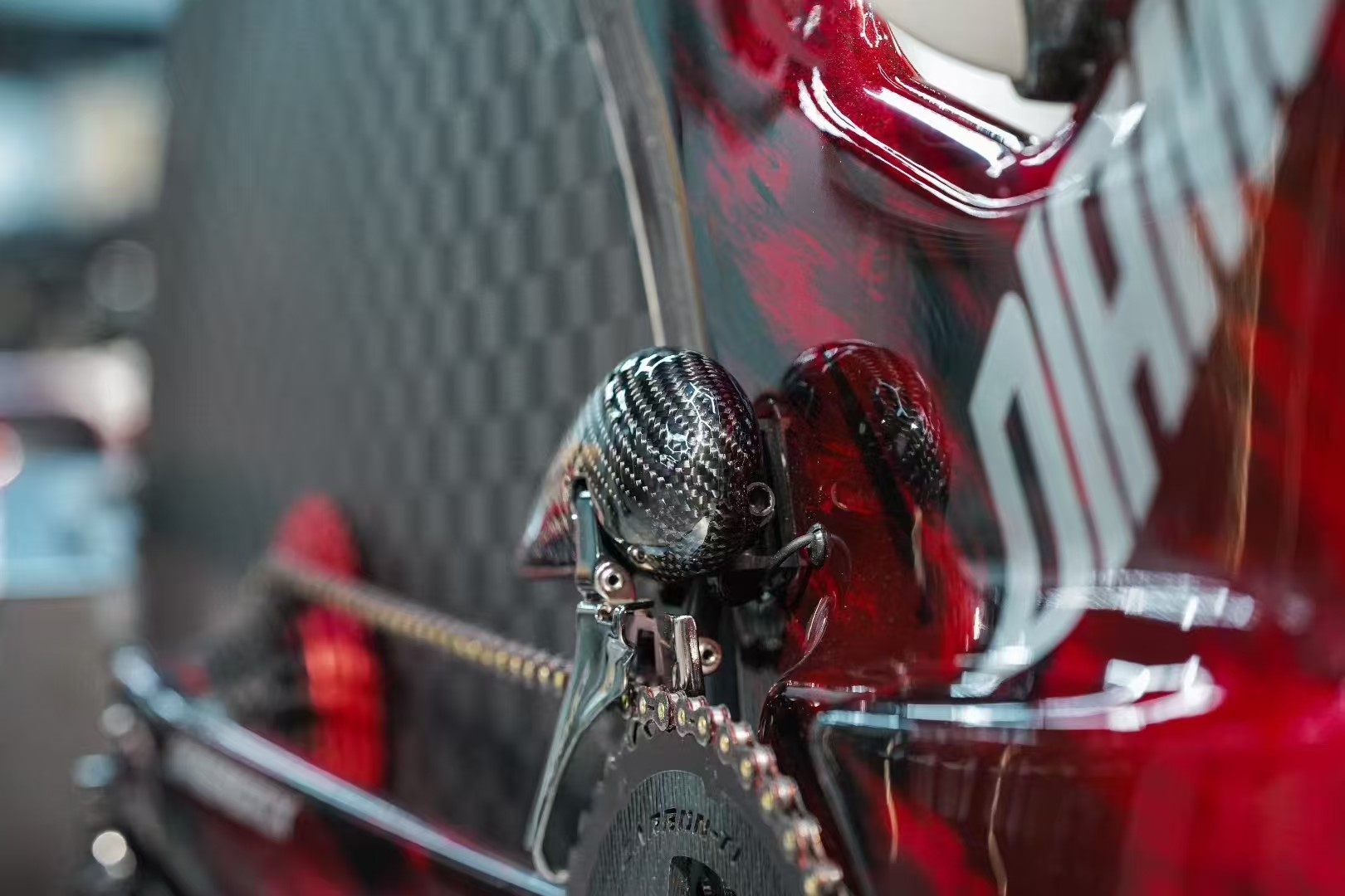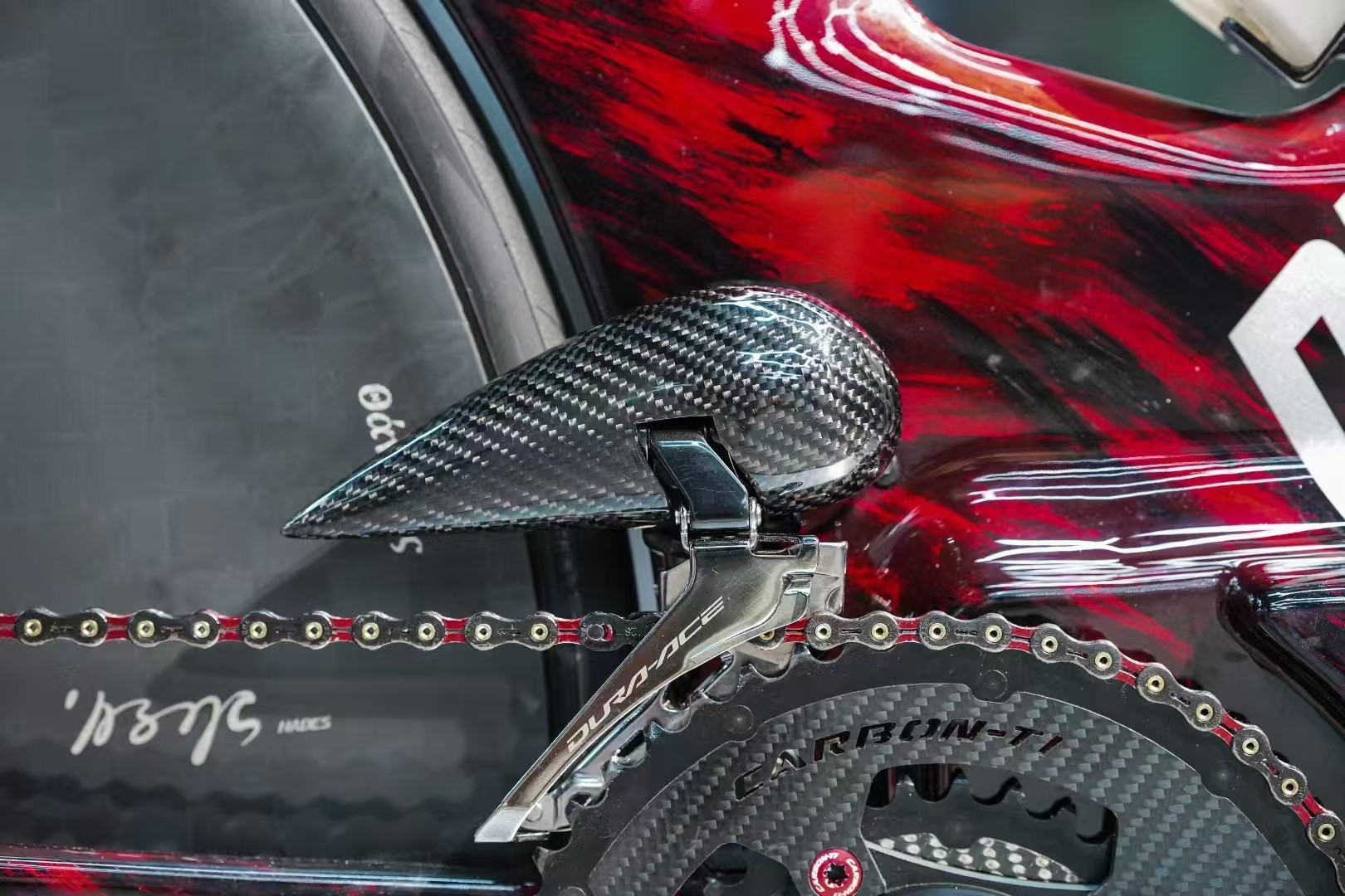 Zooming into the drivetrain, we see the Pandora fairing living in perfect harmony with the world’s best components. The air-optimized carbon fiber shell sits proudly next to Shimano’s DURA-ACE derailleur and a CARBON-TI carbon crankset. This image highlights a critical advantage: the thermal resistance and structural integrity of IPCON PPA CF. It can withstand the heat and stress generated next to the chain and derailleur, ensuring reliable performance mile after mile.