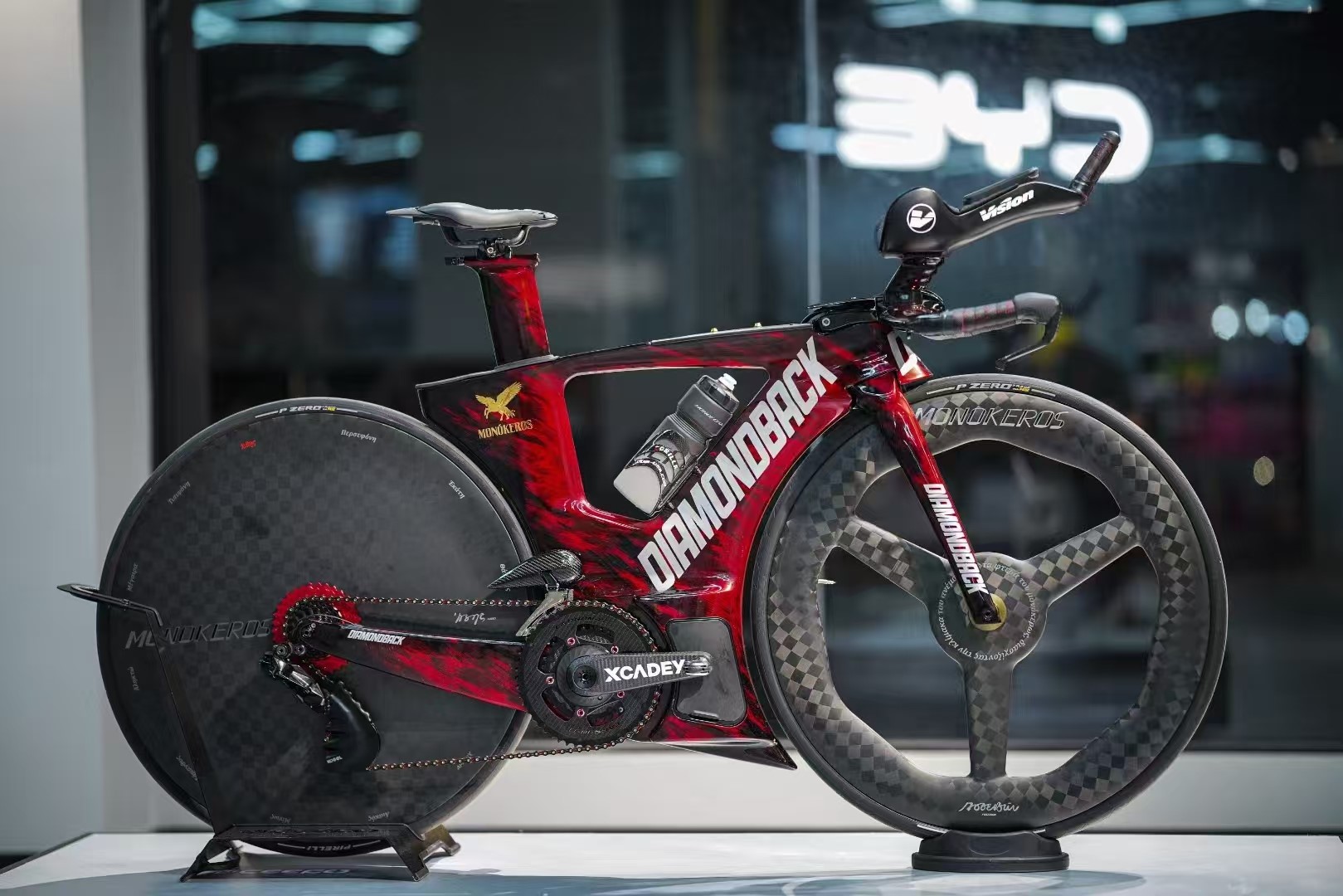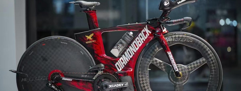Behold the full majesty of the machine. This stunning red and black Diamondback triathlon bike is now elevated with MONOKEROS’s golden branding and its signature Pandora components. The harmony between the factory carbon frame and the 3D-printed add-ons is perfect. From the Vision aero bars to the deep-section wheels, every part is chosen for speed. The Pandora fairing, printed in IPCON PPA CF, is not an add-on; it’s a fully integrated part of this speed machine, proving the material’s capability to perform alongside traditional carbon fiber components.