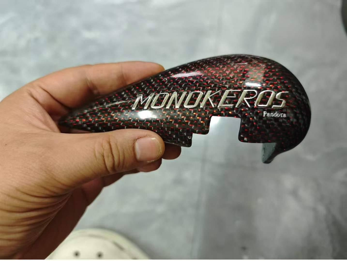Now, we see the star of the show in the palm of a hand. This is the Pandora fairing itself, a stunning, organic form with a flawless red and black carbon fiber finish. The MONOKEROS and Pandora logos are crisply printed, a testament to the excellent layer adhesion and surface quality of IPCON PPA CF. This image answers the question: “Can a 3D-printed part truly look and feel professional?” The answer is a resounding yes.