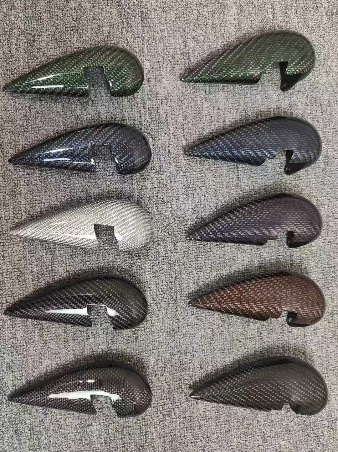 The development process is revealed. Here we see a selection of iterated designs, each with subtle variations in color, texture, and finish. This showcases one of the greatest strengths of using 3D printing with IPCON PPA CF: rapid prototyping and customization. Designers can test, refine, and perfect aerodynamic shapes without the cost and time of traditional carbon fiber molding, accelerating innovation from the drawing board to the race course.