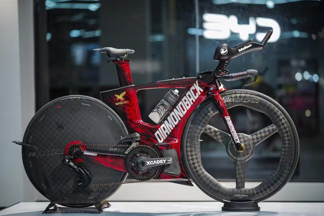 Behold the full majesty of the machine. This stunning red and black Diamondback triathlon bike is now elevated with MONOKEROS’s golden branding and its signature Pandora components. The harmony between the factory carbon frame and the 3D-printed add-ons is perfect. From the Vision aero bars to the deep-section wheels, every part is chosen for speed. The Pandora fairing, printed in IPCON PPA CF, is not an add-on; it’s a fully integrated part of this speed machine, proving the material’s capability to perform alongside traditional carbon fiber components.